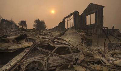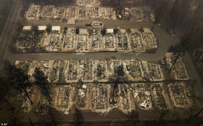 | California Is Now Undergoing Fiery Purification Process Most recently in the Sierra Nevada foothills of Northern California—the town of Paradise was almost completely burned down and destroyed in the state’s now historically worst wildfire disaster—named as ‘Camp Fire’ (but triggered by sparks from electrical wires) ! • With 84 confirmed deaths thus far, and nearly 13,000 still missing—(so now have to hire DNA experts from Colorado to confirm the identities of bodies which are too difficult to confirm by physical eyes). • More than 12,700 structures (including approximately 10,500 homes) destroyed. |