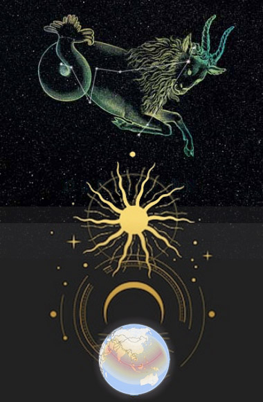 | Celestial Alignment of Constellation Capricorn, Sun and Moon on December 26th, 2019. ( Art sources: Peratek / Time and Date ) |
