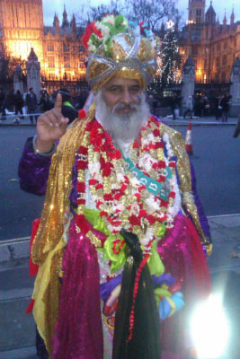 In London, UK—Maitreya guised as an ordinary man playing a guitar (March 18, 2016) and an Indian holy man (November 29, 2015). Manifesting in the world through His mayavirupa (or self-created light vehicle)—Maitreya can create any look He wants (including as a homeless person or member of a minority), so we should not get attached to any particular image of Him. (photos from Share International) |